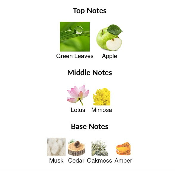 Top notes are Green Leaves and Apple; middle notes are Lotus and Mimosa; base notes are Musk, Cedar, Oakmoss and Amber.