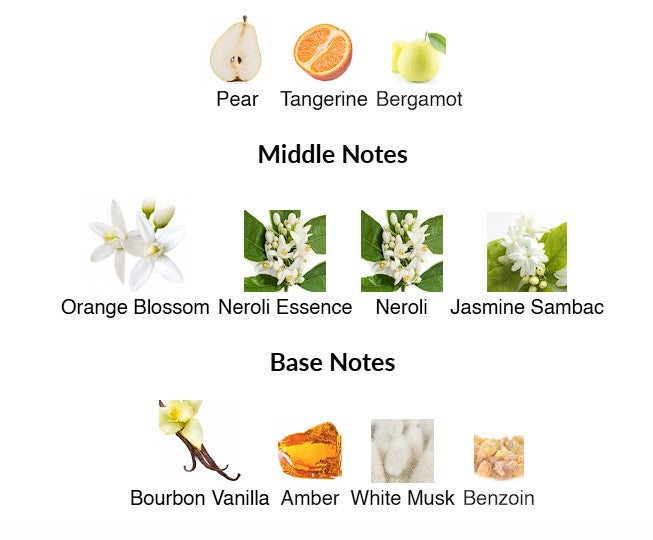 Top notes are Pear, Tangerine and Bergamot; middle notes are Orange Blossom, Neroli Essence, Neroli and Jasmine Sambac; base notes are Bourbon Vanilla, Amber, White Musk and Benzoin.