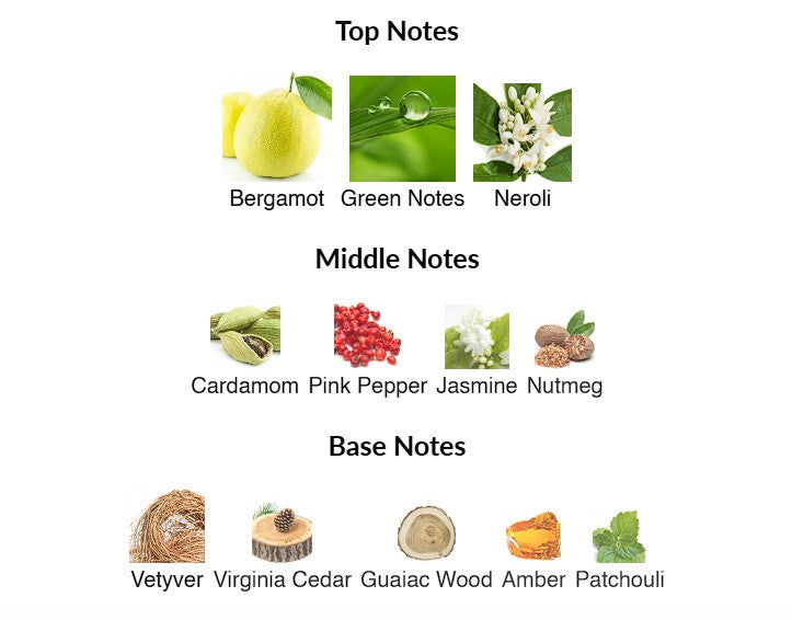 Top notes are Bergamot, Green Notes and Neroli; middle notes are Cardamom, Pink Pepper, Jasmine and Nutmeg; base notes are Vetyver, Virginia Cedar, Guaiac Wood, Amber and Patchouli.
