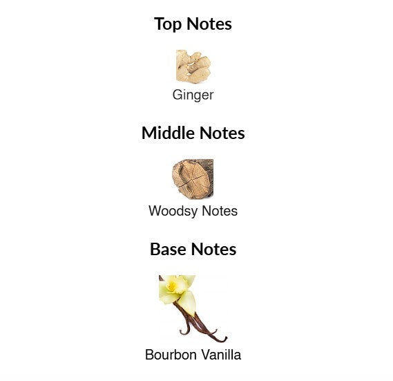 Top note is Ginger; middle note is Woodsy Notes; base note is Bourbon Vanilla.