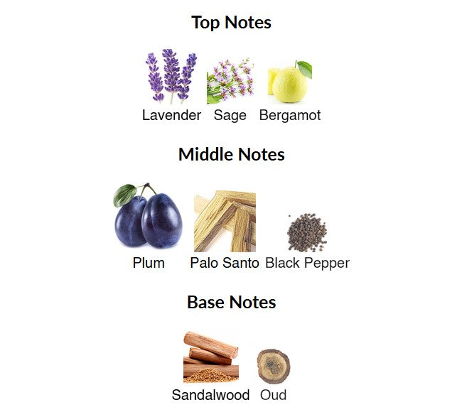 Top notes are Lavender, Sage and Bergamot; middle notes are Plum, Palo Santo and Black Pepper; base notes are Sandalwood and Oud.